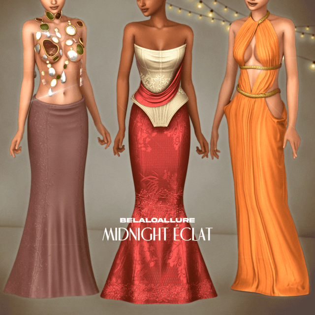 Belaloallure_Midnight Éclat cc collection Midnight Éclat, my new year’s celebration collection . inspired by old Hollywood glamour and icons , featuring corseted bodies, liquid satin draping and figure skimming mermaid gowns . notes : new mesh all LOD custom thumbnail HQ compatible